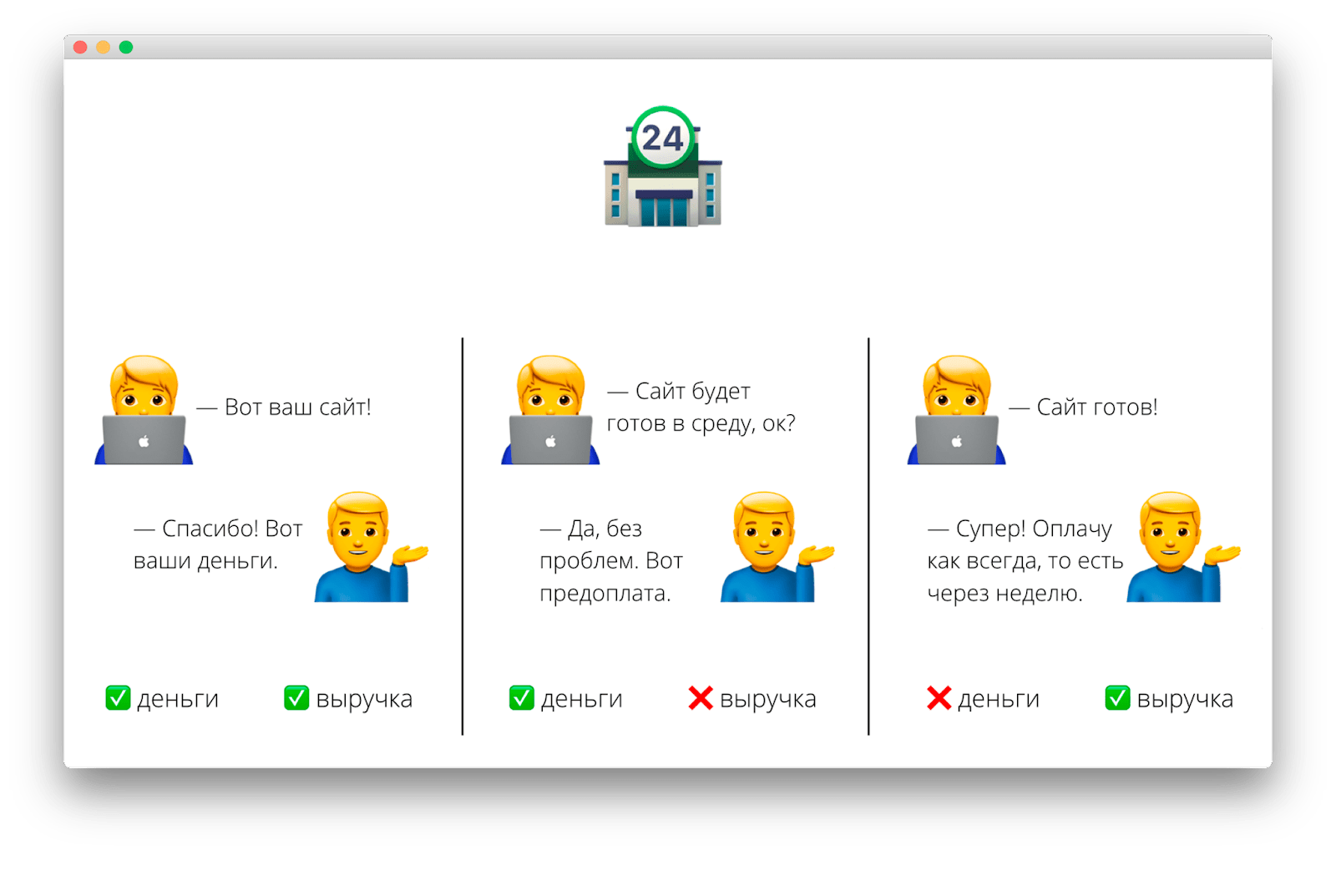 И если для овощного ларька это нормально, потому что продавец выполняет свои обязательства (отдает овощи) в момент передачи денег, то для айти-компании — нет. Ведь она может получить деньги сейчас (аванс), а обязательства (сделать сайт) выполнить только через полгода.