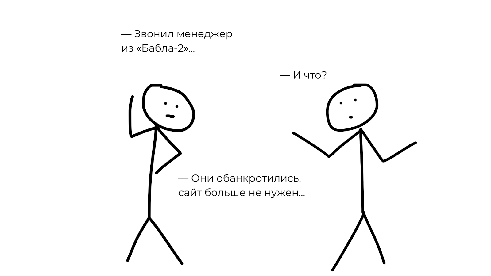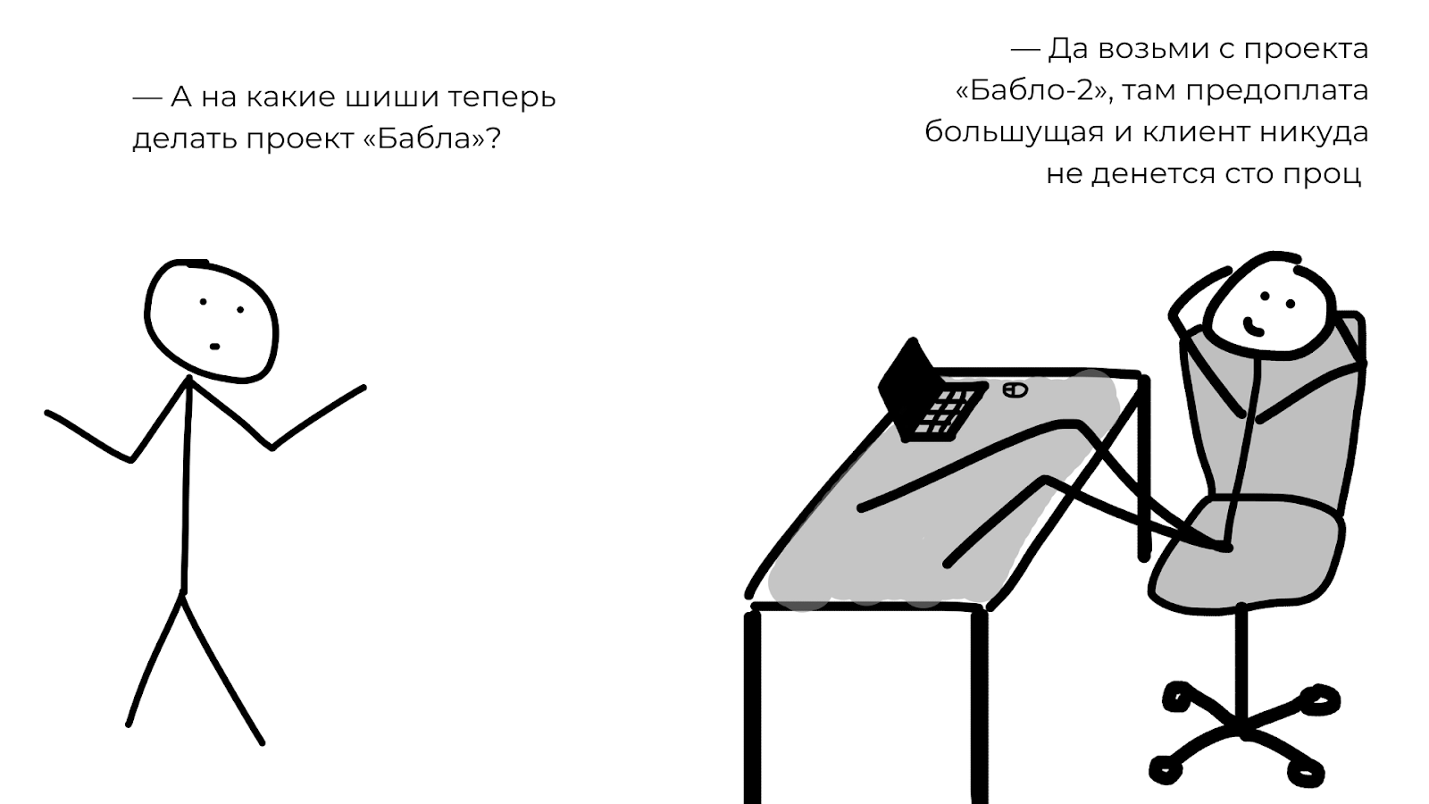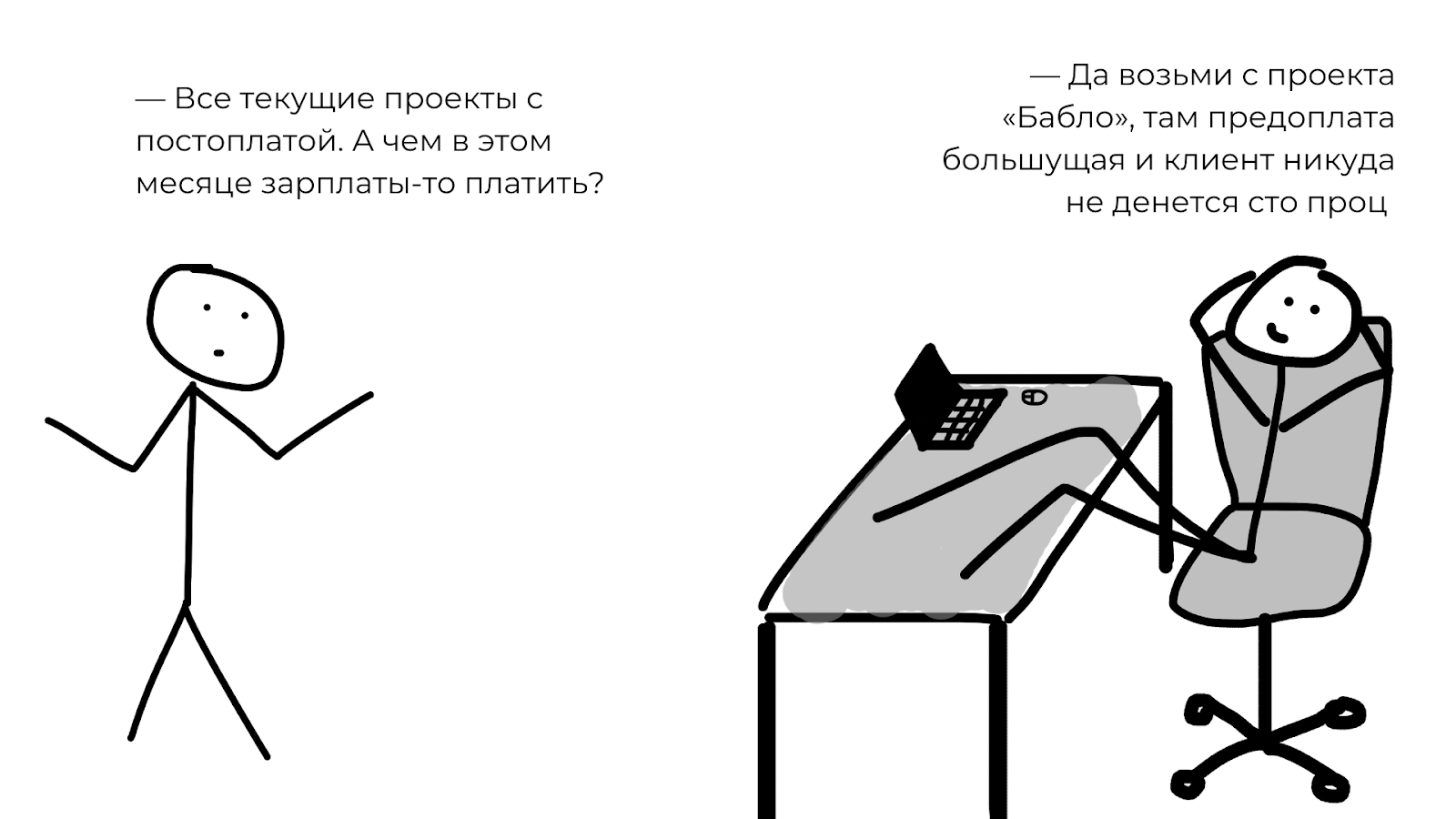 Клиент прекрасно знал, что никто больше не заказывает у «Тьюринга» такие дорогие проекты, и пользовался своим положением. Он мог подписать акт вовремя, а мог не подписать. Мог ответить на сообщение менеджера, а мог не ответить. Или, например, мог подписать акт, но не переводить деньги неделями. Похоже на эмоциональные качели в нездоровых отношениях, правда?