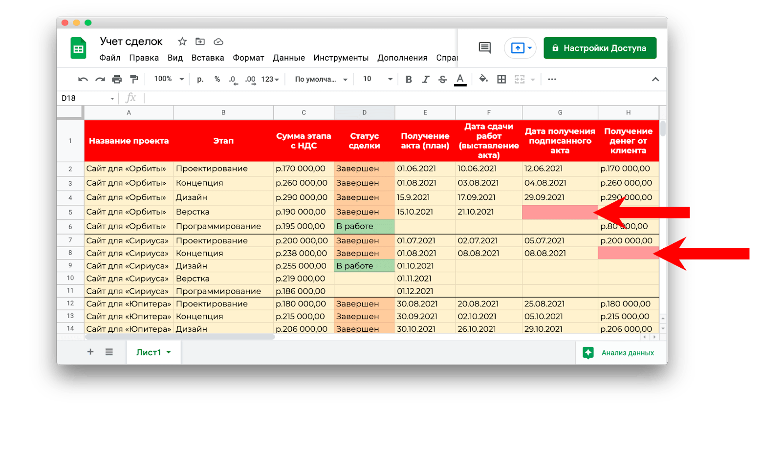 Итак, нам нужно было выбивать дебиторку. Но для этого сначала нужно записать всех должников в список. Для этого в учете сделок мы сделали одну интересную настройку. Например, у проекта стоит дата подписания акта 15 октября. Если 16 октября менеджер не поставит около проекта галочку, ячейка загорится красным. Аналогично и с оплатами. Если акт был подписан, а деньги не приходили, ячейка тоже подсвечивалась: