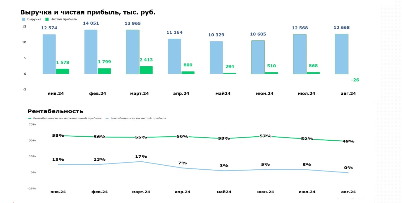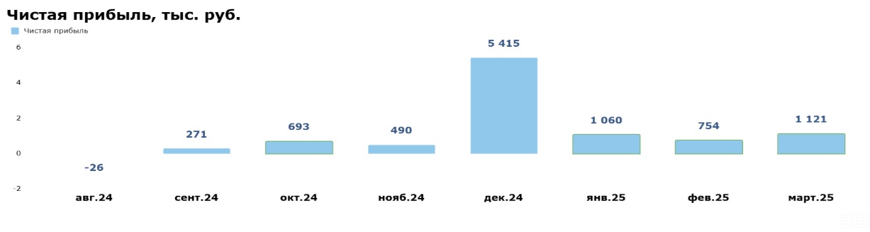 Чистая прибыль в марте 2025 года составила 1,1 млн руб. при рентабельности по ЧП 8%. Это означает рост чистой прибыли на 44% по сравнению с августом 2024 года.