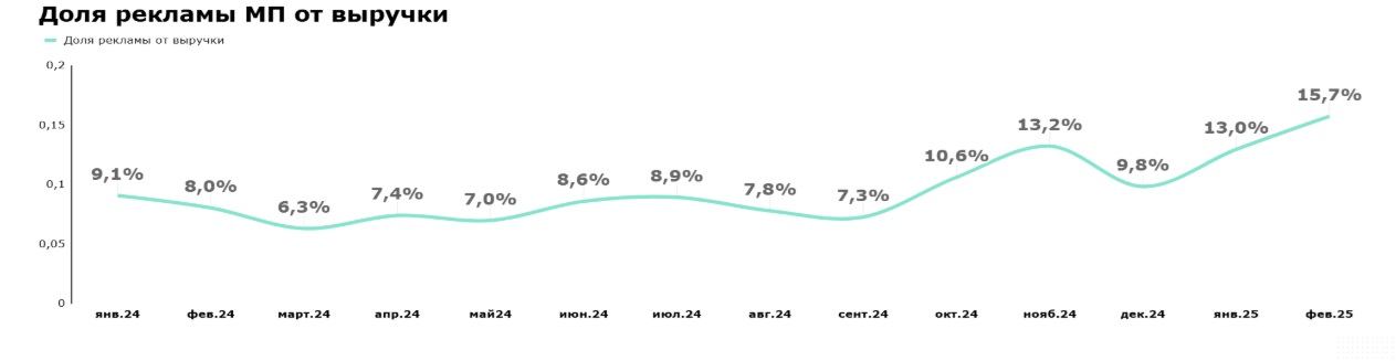 На февраль 2025 года доля затрат на рекламу в маркетплейсах достигла критических 15,7% от выручки. Чистая прибыль сократилась на 29% всего за месяц (в сравнении с январем 2025 года), сигнализируя о резком падении рентабельности.