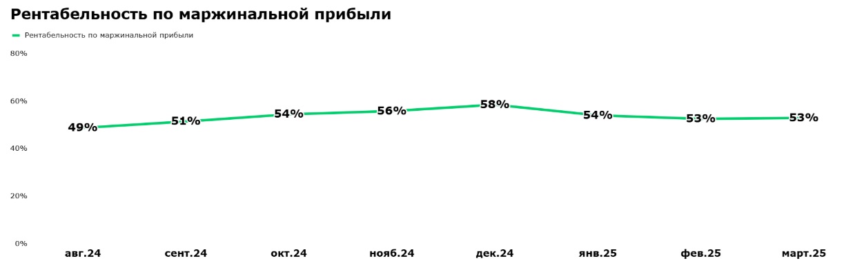 Калькулятор цен и оптимизация рекламных затрат помогли вывести маржинальность на устойчивый уровень. К марту 2025 года был достигнут показатель маржи 53%.