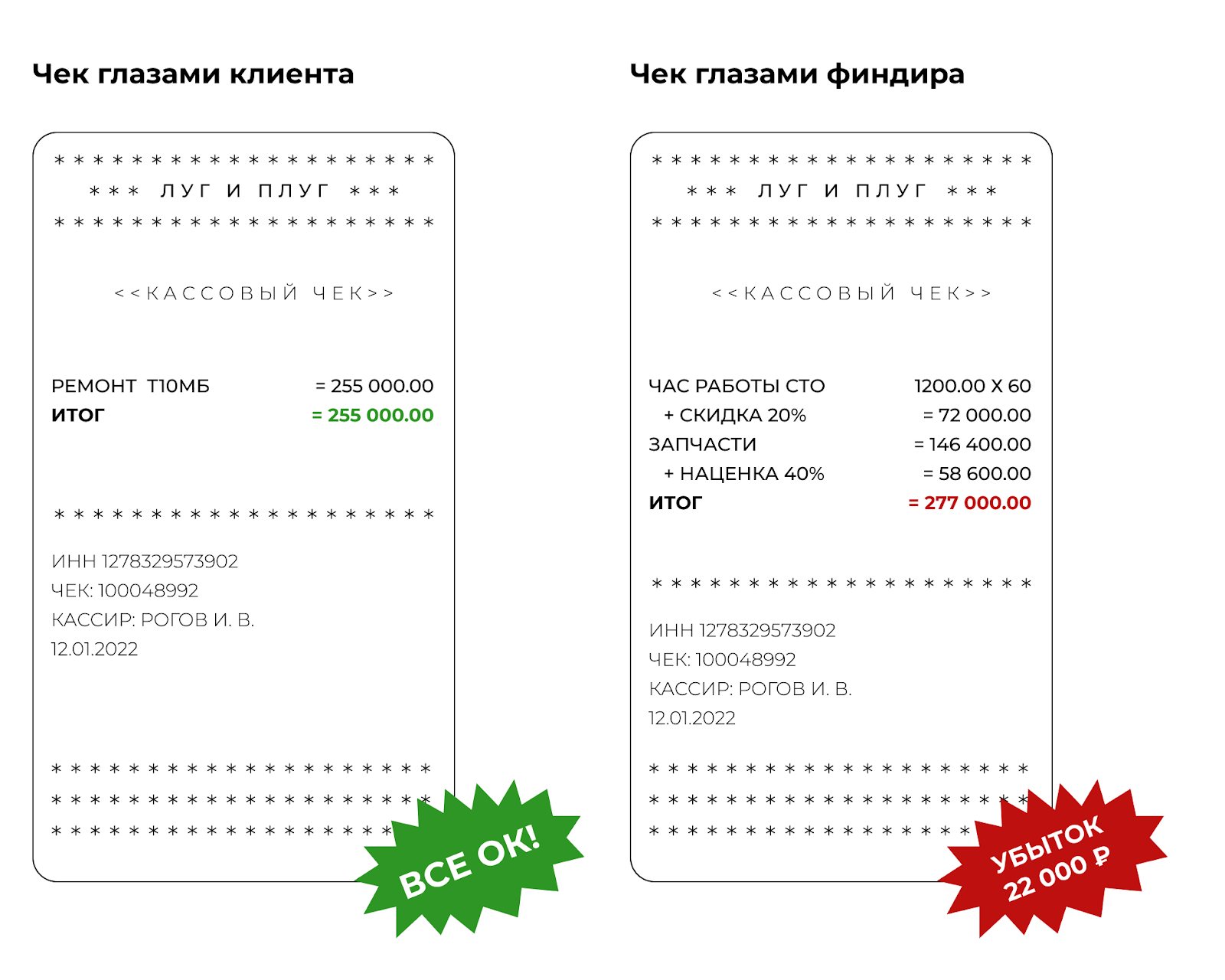 Я разделила ремонт и продажу запчастей на два направления и увидела, что с продажей запчастей все супер, а вот с ремонтом — нет. Парадокс, но в ремонтной компании ремонт был убыточным направлением. Так получилось, потому что «Луг и плуг» давал клиентам большие скидки, чтобы те не ушли к конкурентам. В итоге клиент платил за ремонт меньше, чем стоил час работы СТО:
