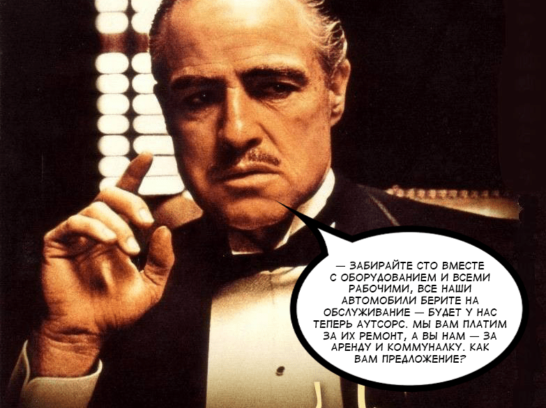 В одном регионе с «Лугом и плугом» работала крупная логистическая компания — пусть будет «Грузовик». У «Грузовика» был собственный автопарк и огромное по площади СТО для его обслуживания, только вот денег туда не вкладывали и прибыли с СТО не получали. Поэтому предложение собственника «Грузовика» было таким: