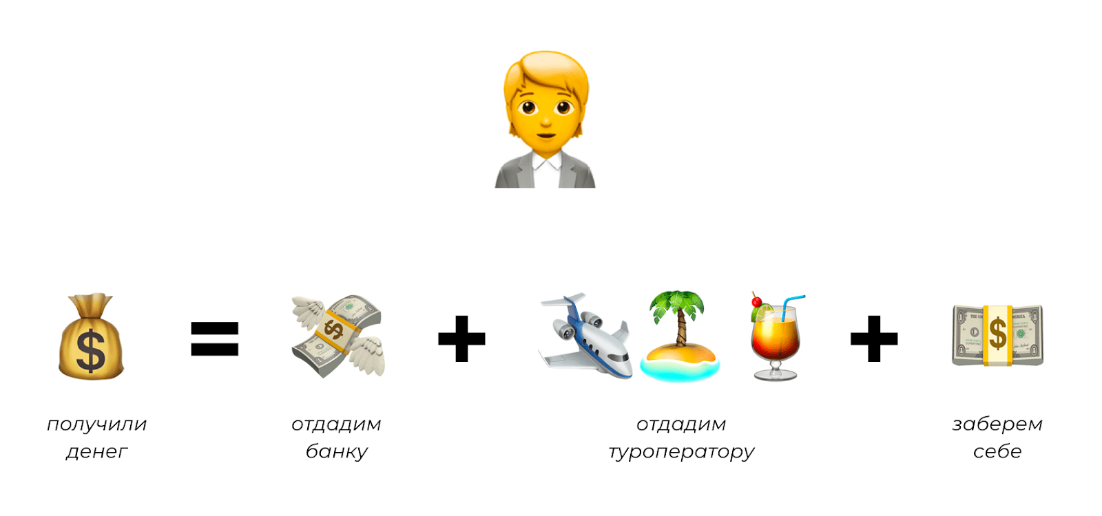 Вот представьте: покупают у «Полета» тур на Бали за 300 000 рублей. Из этих 300 000 рублей выручка агентства — только 30 000, а остальное — стоимость самого тура плюс эквайринг. Собственник видит картину так: