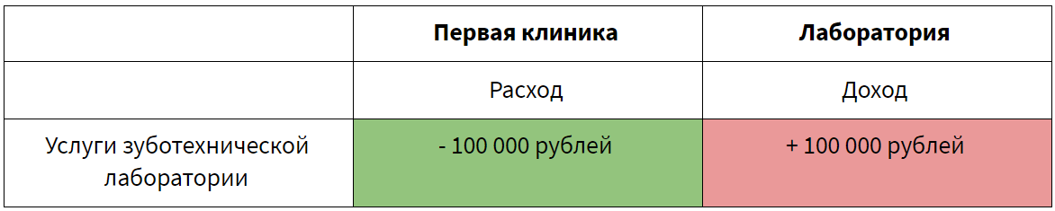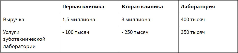В отчете о прибылях и убытках клиента предусмотрена строка затрат на услуги лаборатории. Эти суммы при расчетах прибыли клиник отражаются, как и все расходы, со знаком минус. А в той же строке у лаборатории суммируются со знаком плюс.