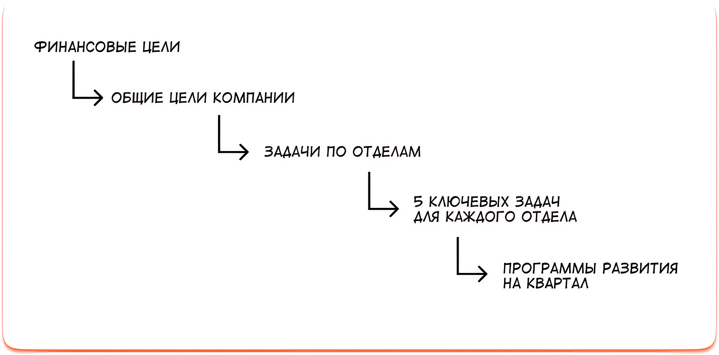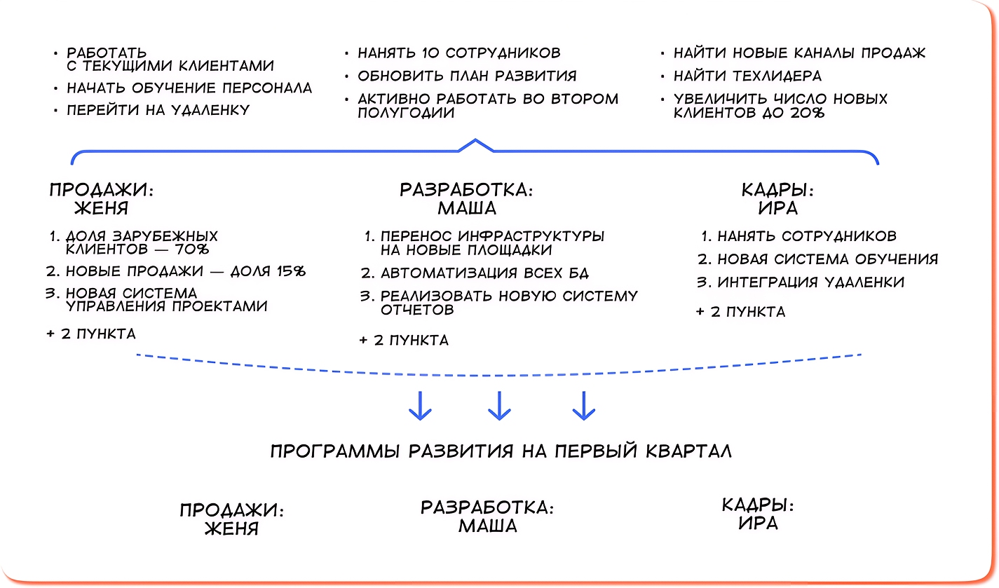 Из общих задач каждый руководитель отдела получил по пять ключевых и назначил ответственных. А затем из ключевых выделили планы развития по отделам на первый квартал.