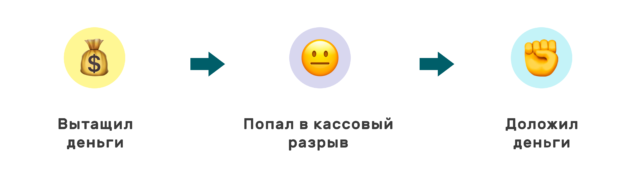 Конечно же, собственник не просто так тратил свои деньги на нужды компании. Периодически компания попадала в кассовые разрывы, и другого пути просто не было. Но кассовые разрывы чаще всего случались из-за того, что собственник перед этим выводил деньги себе — иногда слишком много, иногда просто не вовремя.