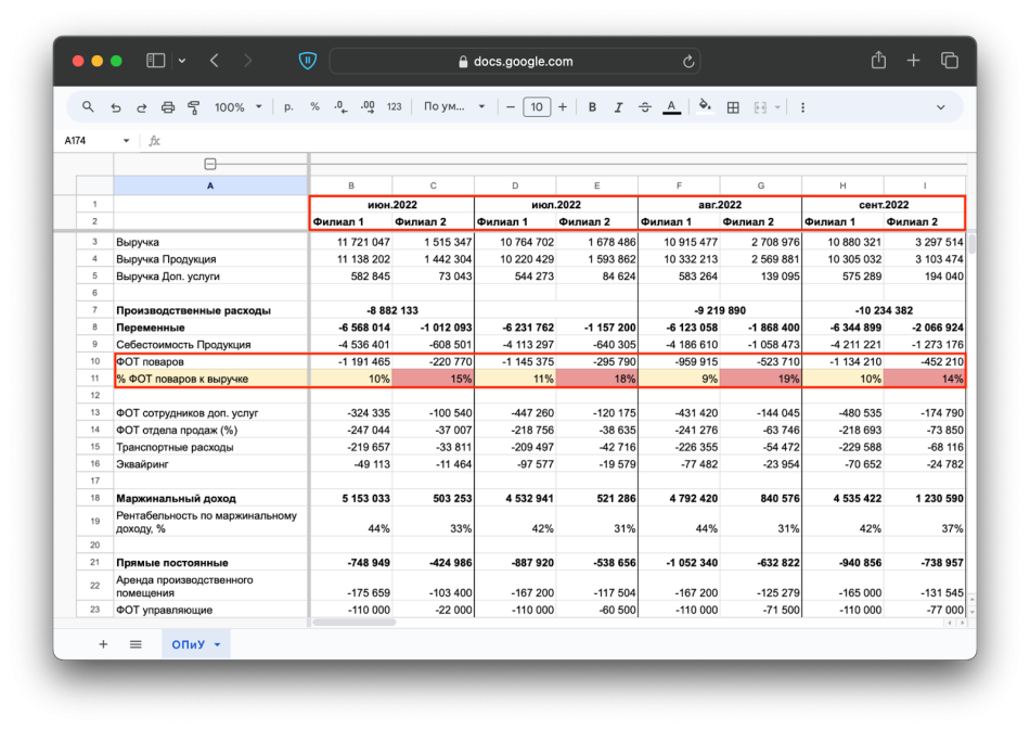 Чтобы понять, как у «Вкусно» обстоят дела с прибылью, финдиректор первым делом собрала ОПиУ и заметила другую проблему: соотношение расходов и выручки в филиалах различается.