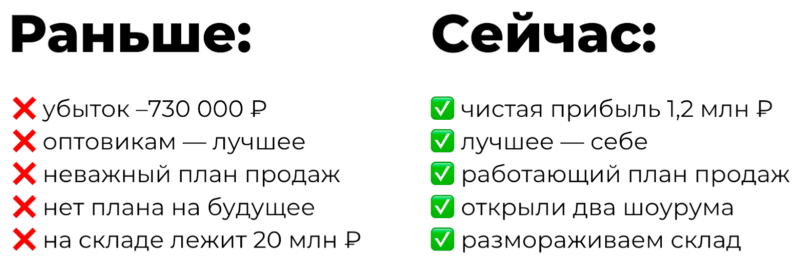 За время работы с «Иглой» мы вышли из –730 000 рублей убытка в +1,2 млн чистой прибыли. Для этого мы пересмотрели подход к ценообразованию, перестали отдавать оптовикам классные вещи, активизировали продавцов и коммерческого директора, открыли один шоурум, вышли на маркетплейсы.