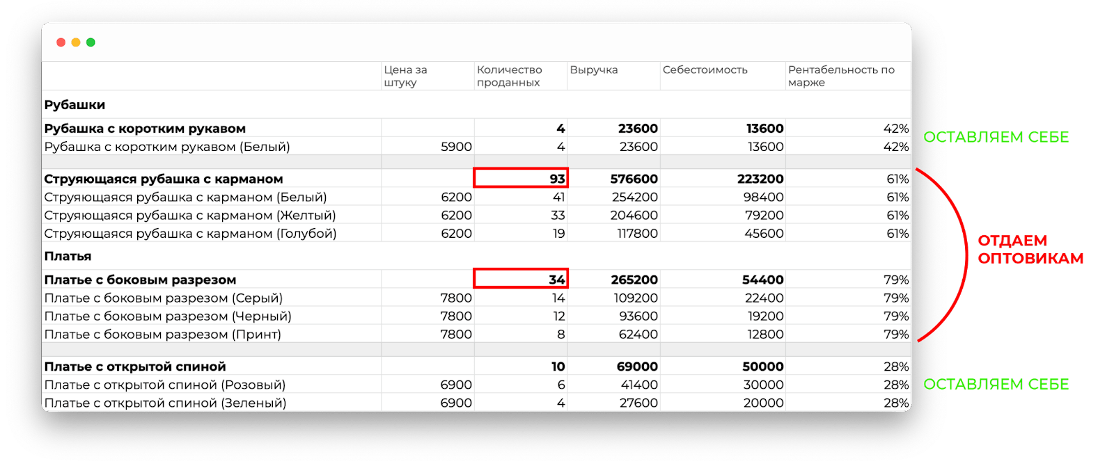 Пока мы разбирались с ценами, нашли еще одну проблему. Иногда «Игла» отдавала оптовикам вещи с высокой маржинальностью, а вещи с низкой оставляла себе. Так получалось, потому что компания не вела управленческого учета и не знала, какие вещи продавались лучше, а какие — хуже.