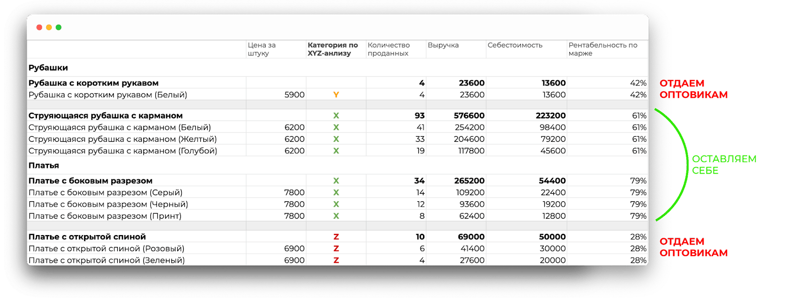 Конечно, оптовики хотели со скидками забирать самые классные модели из новых коллекций. Но после XYZ-анализа собственник «Иглы» старался отдавать им больше вещей, которые плохо продавались на точках и приносили меньше всего прибыли.
