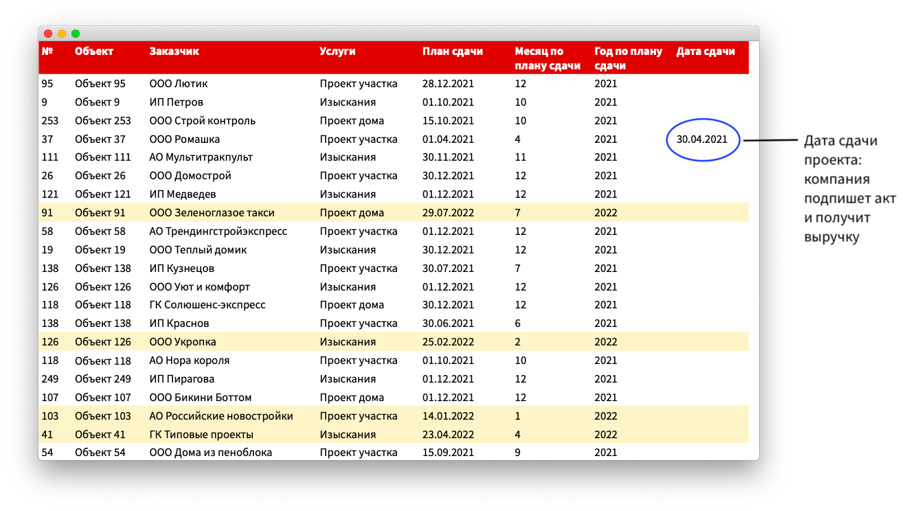 План выручки → 120 млн ₽ до конца года. Чтобы запланировать выручку, нужно было узнать, когда какие проекты завершатся. Мы собрали всех главных инженеров и по каждому проекту запланировали дату сдачи. Получилась вот такая табличка: