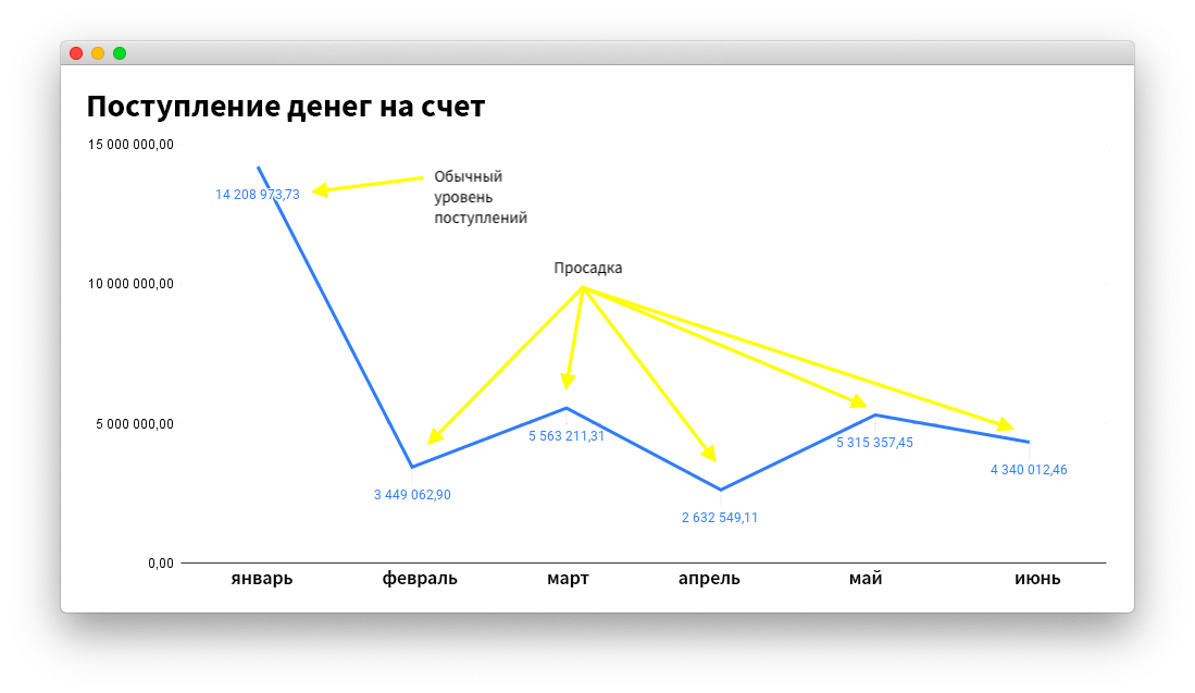 Если денег резко перестало хватать, значит, есть проблема с возросшими расходами или снизившимися доходами. Сначала я пошел искать причину в расходах: может, какие-то расходы сильно выросли и поэтому денег не хватает. Но компания тратила столько же, сколько тратила всегда. А вот по поступлениям просадка: