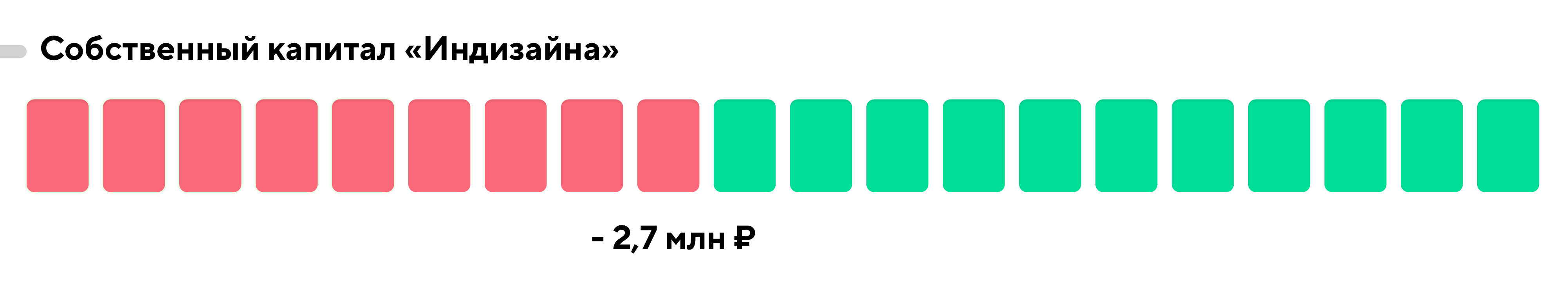 Всё это помогло нам уменьшить дыру в собственном капитале «Индизайна» до - 400 000 рублей. При этом до конца года компания планирует зашить ее полностью и выйти на положительный собственный капитал в 150 000 рублей: