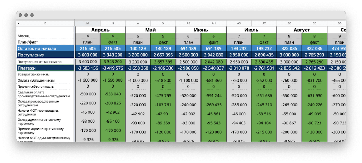 Контроль выбытий. Чтобы авансы клиентов не разлетались на дивиденды и импульсивные покупки для офиса, я внедрила БДДС — бюджет движения денежных средств. В нем мы прописываем, на что компания будет тратить деньги в следующем месяце.