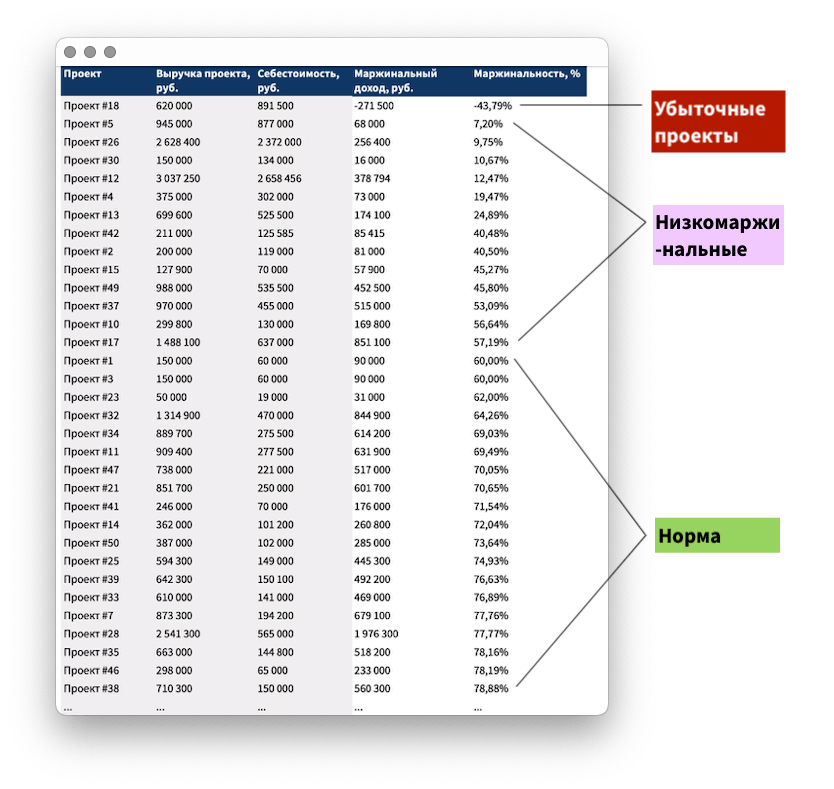 Мы определили норму маржинальности проектов, но у компании в работе уже были низкомаржинальные и убыточные проекты — их нужно было доделывать. И чтобы как-то повысить их маржинальность, мы стали анализировать переменные расходы.
