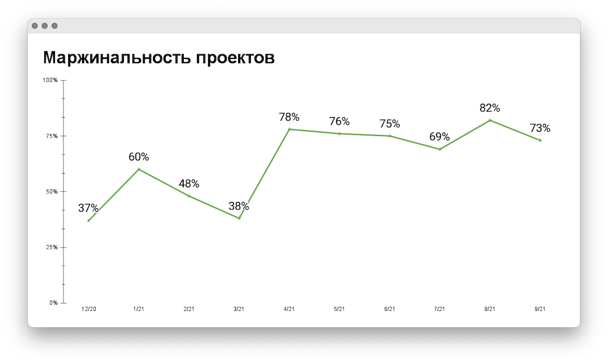 - посчитали маржинальность проектов и определили норму — от 60% и выше. Перестали брать в работу убыточные и низкомаржинальные проекты;