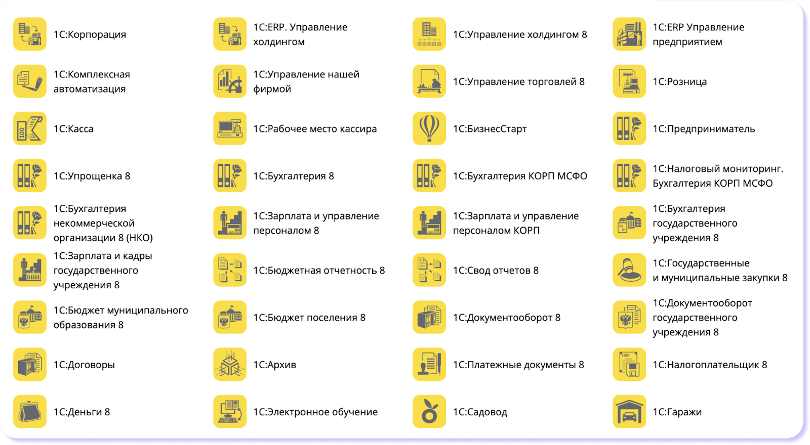 По задачам бизнеса можно выделить такие виды 1С: