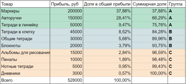 Часть сводной таблицы с результатами ABC-анализа. Здесь наглядно показано, какие товары приносят больше прибыли, а какие — меньше.