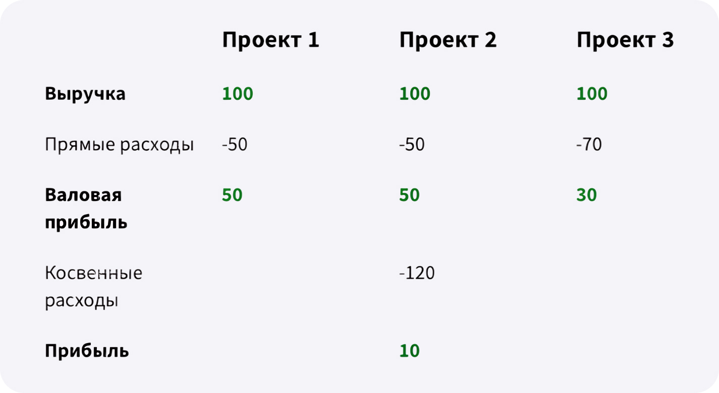 Смысл валовой прибыли в том, чтобы оценить эффективность направлений бизнеса. Например, ваша компания делает сайты, а еще настраивает рекламу. Это два разных направления с разными прямыми расходами. Но, например, бухгалтер у вас один — значит, его зарплата идет в косвенные расходы и не участвует в расчете валовой прибыли.