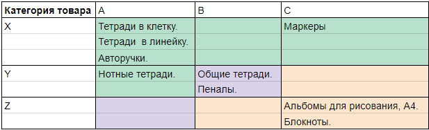 Итог анализа такой: товары из категорий АХ, ВХ и BY должны быть на складе всегда. Категории AZ, BY и CX пополняются на усмотрение собственника. Товары категорий BZ, CY и CZ держать на складе не нужно.