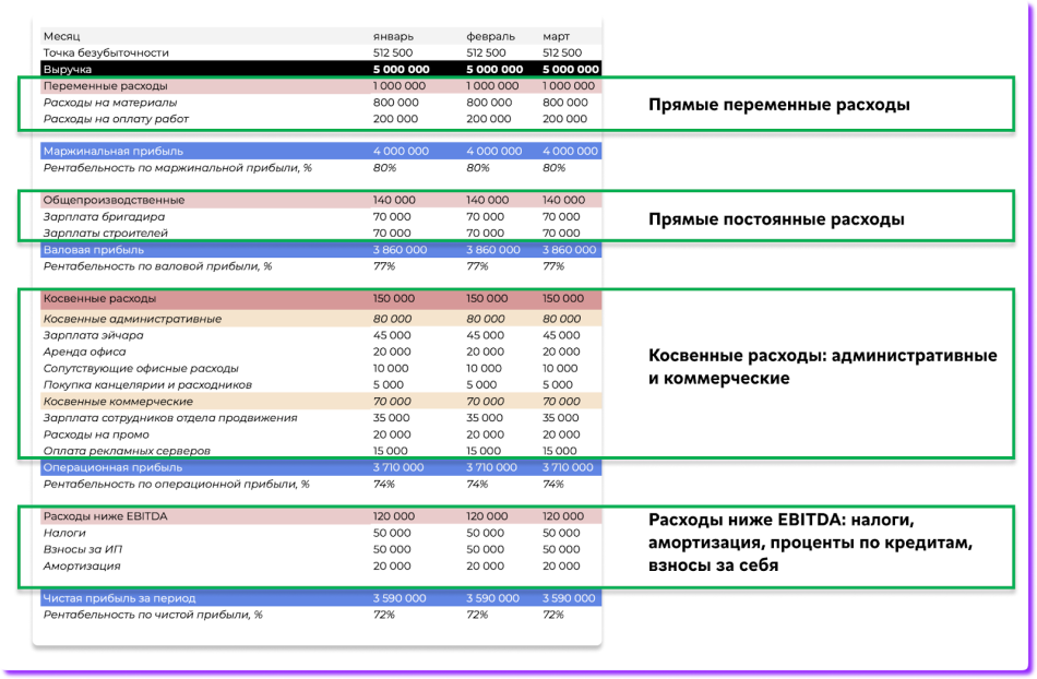 Прямые переменные расходы — появляются в момент признания выручки. И напрямую зависят от выручки: выручка растет, переменные расходы растут; заказов нет — и расхода нет. Обычно сюда включают всё, что входит в себестоимость продукции или услуги. К примеру, для булочной переменными будут расходы на муку и масло, для парикмахерской — на красители, шампуни, воду, для стройки — на кирпичи и бетон.