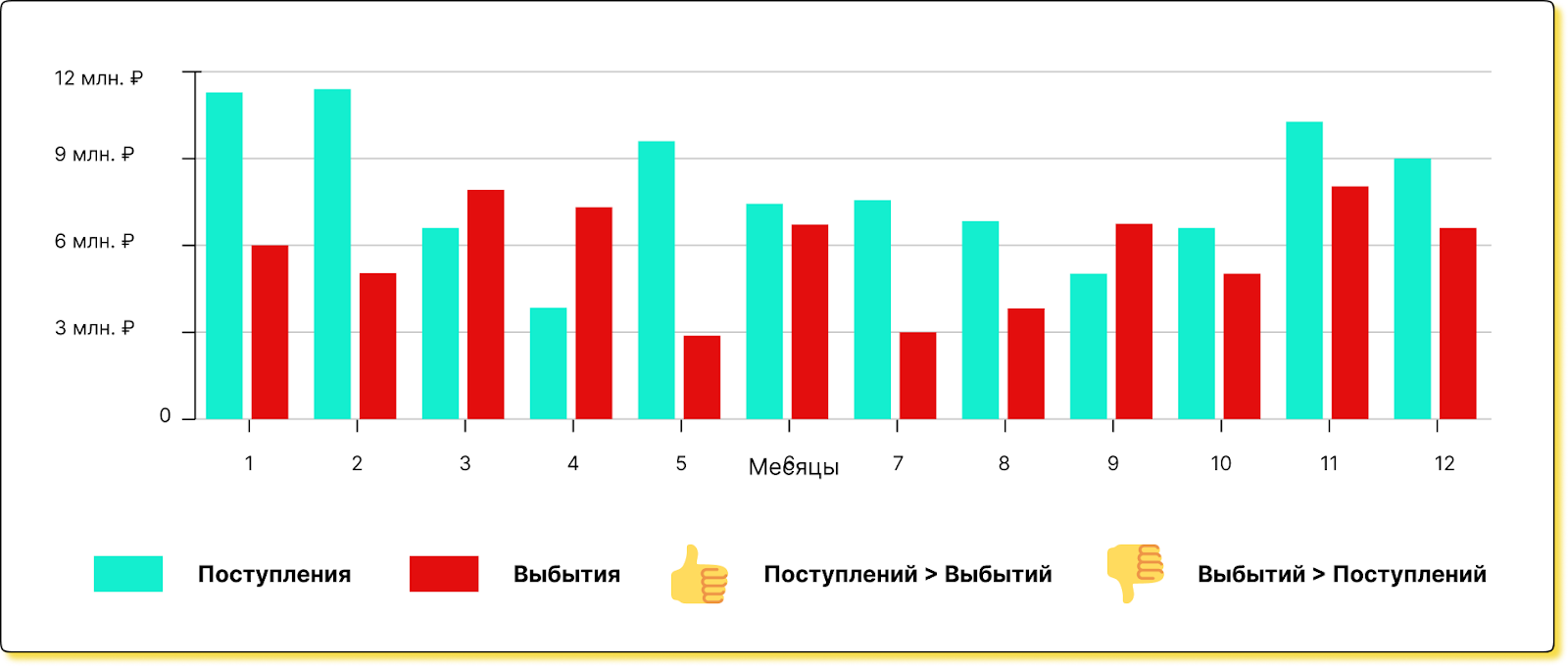 Соотношение поступлений и выбытий важно оценивать не только в моменте, но и в динамике: если приходит всё меньше денег или уходит всё больше — это тревожный звоночек.