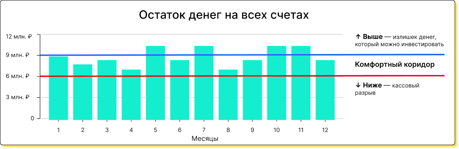 остаток ниже коридора, допустим, 5 млн ₽, — денег не хватит на текущие расходы, и есть риск попасть в кассовый разрыв;