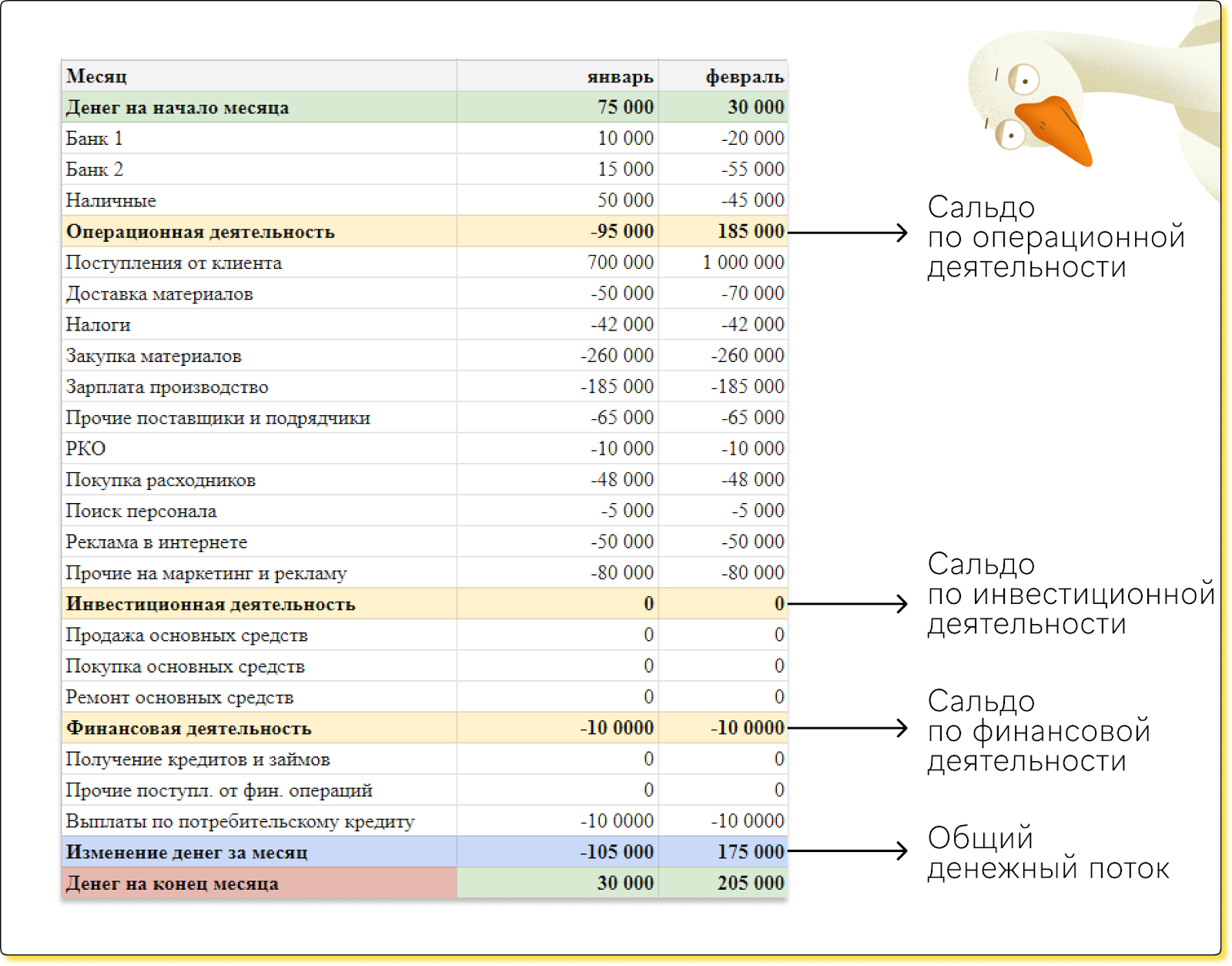 Отрицательное сальдо, или отрицательный денежный поток по операционной деятельности, не всегда сигнализирует о проблемах. Если бизнес только начинает развиваться, минусовое сальдо — это окей.