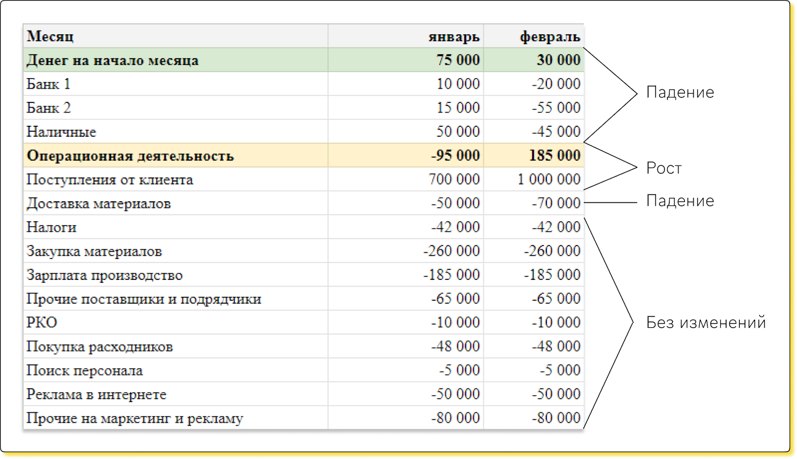 Вот для примера горизонтальный анализ ДДС в разрезе двух месяцев: смотрим, как менялся каждый показатель от января к февралю ↓