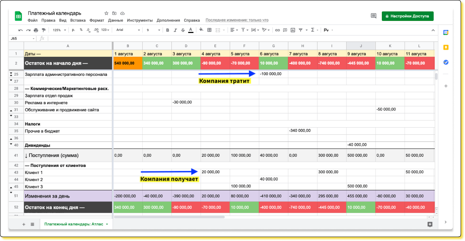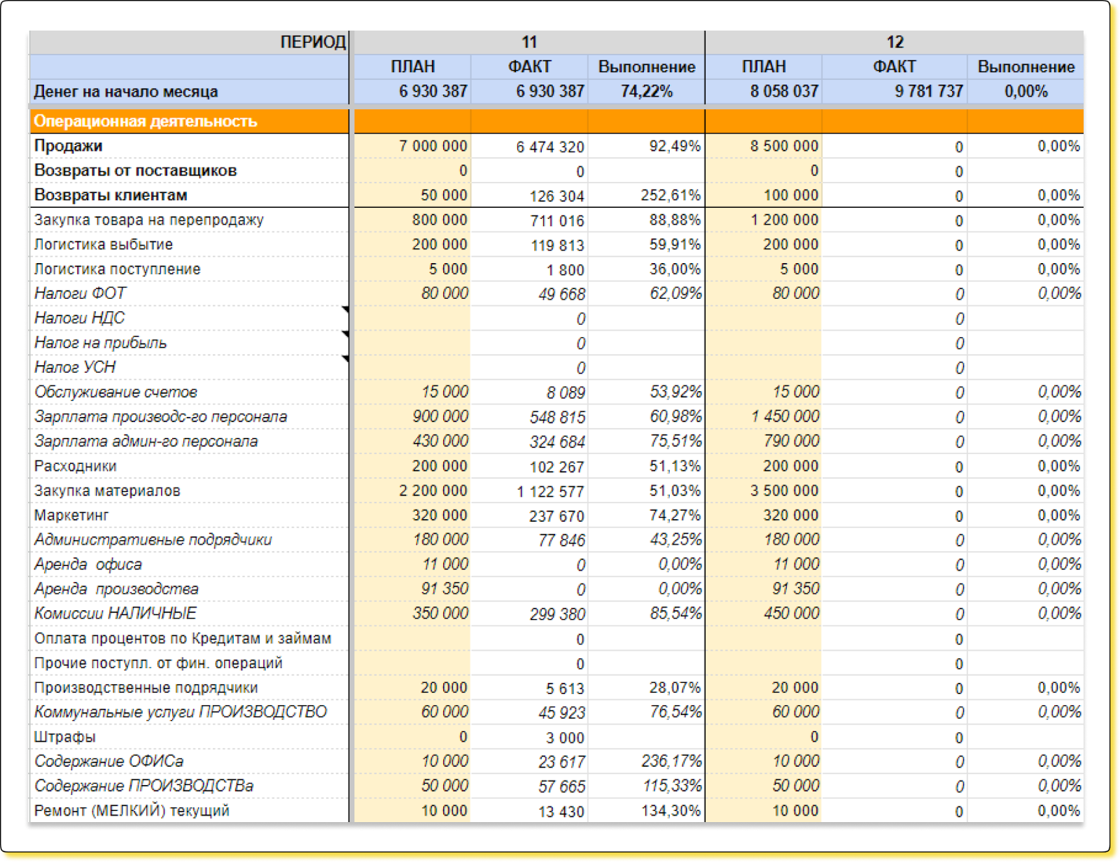 БДДС — это план, но можно предусмотреть в каждом месяце столбец для фактических значений, чтобы потом проверять, совпал ли план с фактом. Например, если планировали потратить на рекламу 100 000 ₽, а потратили 300 000 ₽, — отклонение от плана будет видно в БДДС.