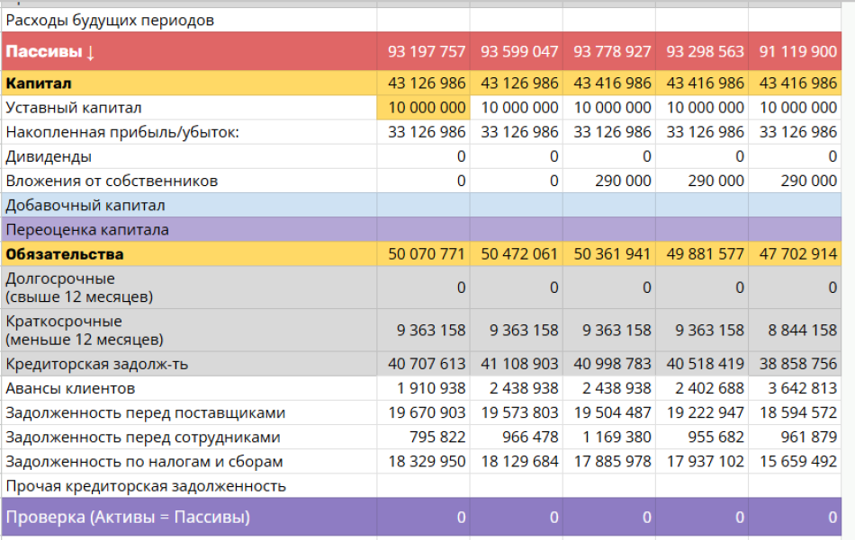 Актив баланса готов. Теперь посчитайте все обязательства. Сначала долги по кредитам и займам: отдельно краткосрочные, отдельно долгосрочные. Затем соберите кредиторскую задолженность. Сколько вы должны поставщикам, сколько сотрудникам, сколько государству по налогам и взносам, сколько у вас авансов от покупателей.
