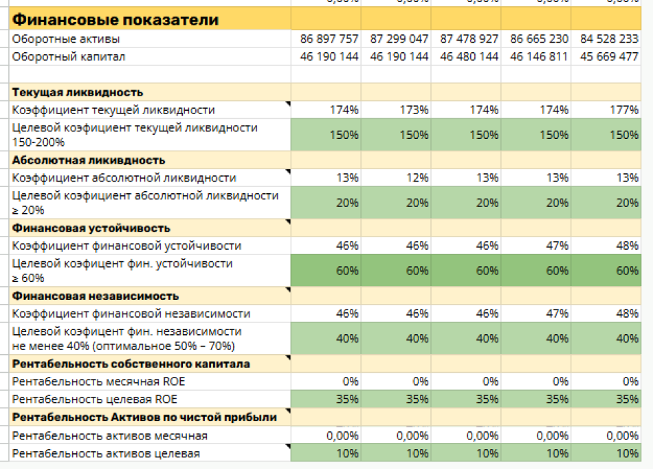 Оптимальное соотношение доли собственного и заемного капитала — примерно 50/50, но минимум 40% собственного капитала необходимо для стабильной работы бизнеса. Это значит, что у компании есть подушка безопасности.