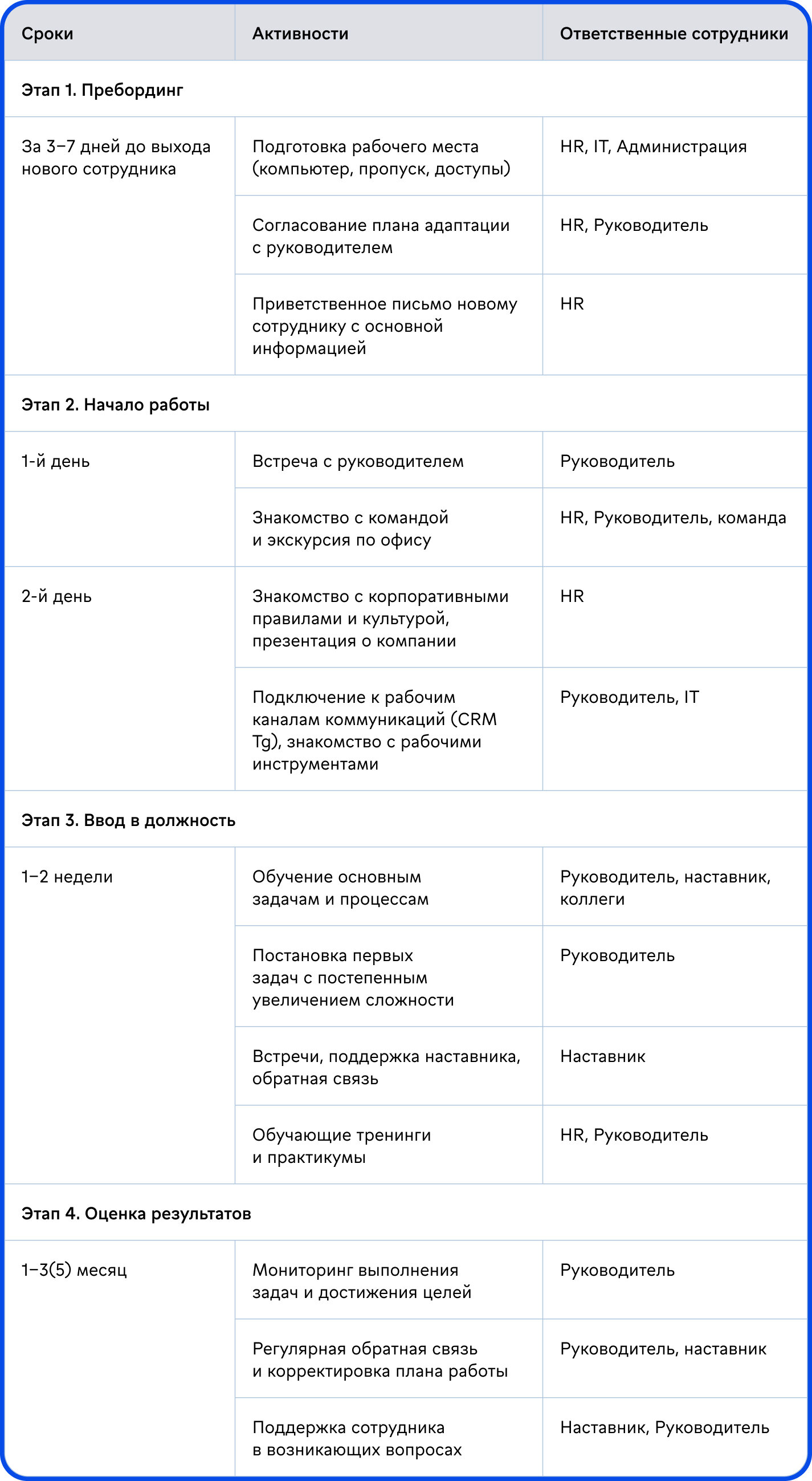 план онбординга: составьте календарь основных этапов ввода: какие задачи в какой период новичок должен решить. Включите в календарь график встреч и тренингов — для обучения и обратной связи.