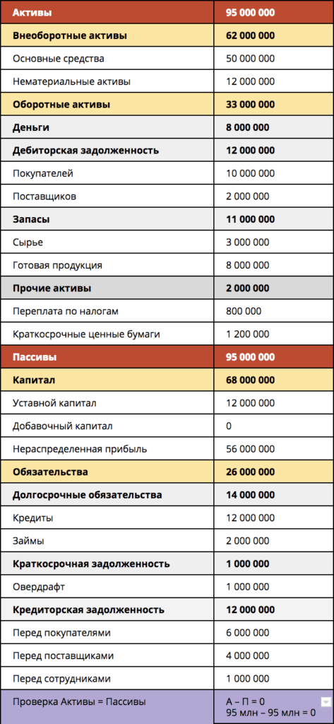 Когда мы посчитаем активы и пассивы и отправим их в один отчет, получится вот такая таблица ↓