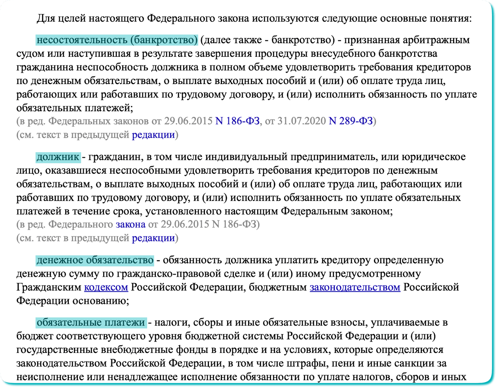 Банкротство, должник, обязательства, кредиторы — определения всех этих терминов есть в 127–ФЗ «О несостоятельности (банкротстве)»: