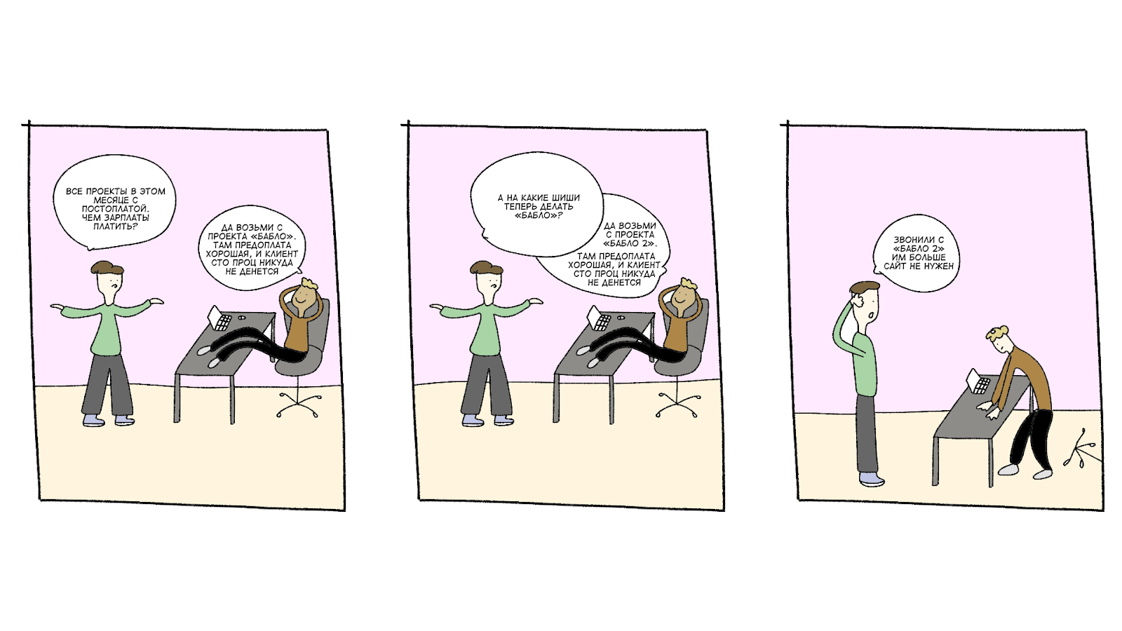 В этой истории собственник попал на мегаболезненный вариант — один из клиентов отказался от сотрудничества и попросил вернуть предоплату. Компанию ждал огромный кассовый разрыв. Закончилось тем, что собственнику пришлось вкладывать свои средства, иначе пришлось бы закрывать бизнес.