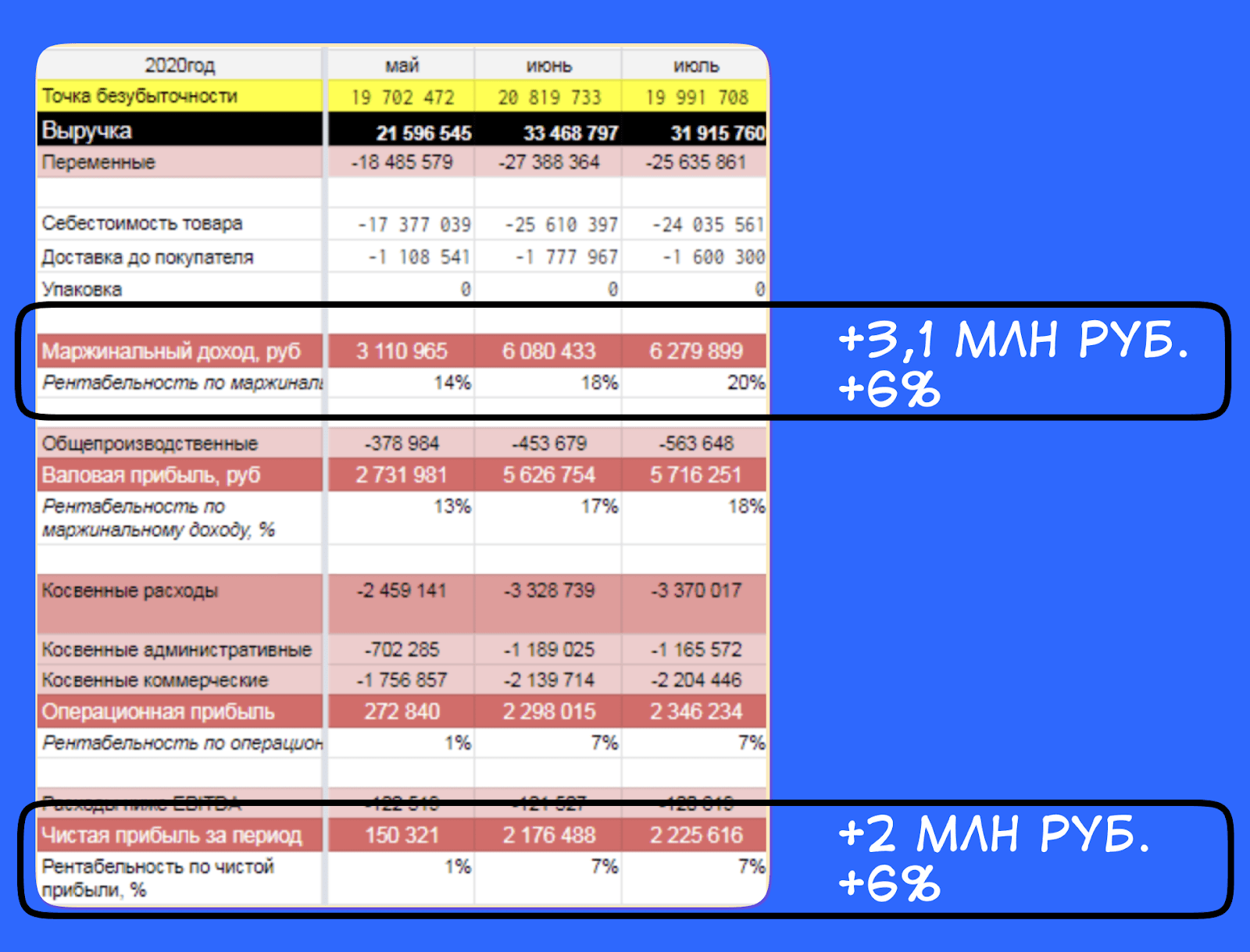 Как видите, при оборотах в 20–30 млн рублей даже небольшой рост маржинальности и рентабельности дает существенный рост чистой прибыли.