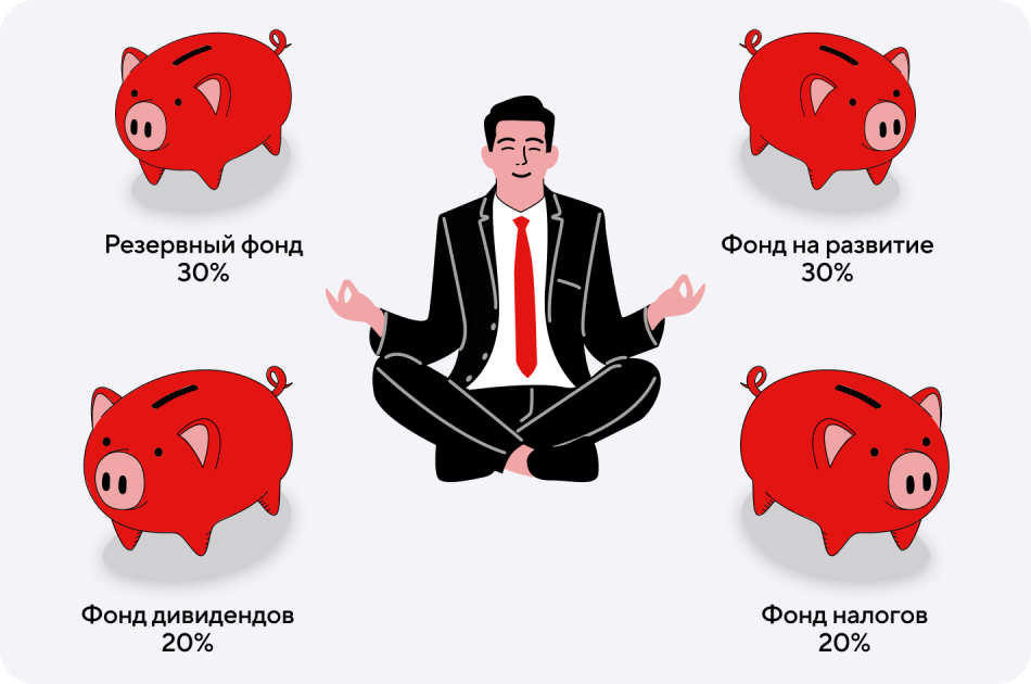 Все деньги, которые поступают на счет, полезно распределять по фондам внутри компании. При этом счета нужно оплачивать строго из того фонда, который предназначен конкретно для этих нужд. Собственники бизнеса как будто раскладывают деньги по разным копилкам. Сколько целей у компании, столько и должно быть фондов: на налоги, на развитие, на зарплату, на оплаты поставщикам. Каждый месяц в каждый фонд нужно откладывать процент от поступления денег. Такая система поможет сохранить стабильность и выйти из кризиса.