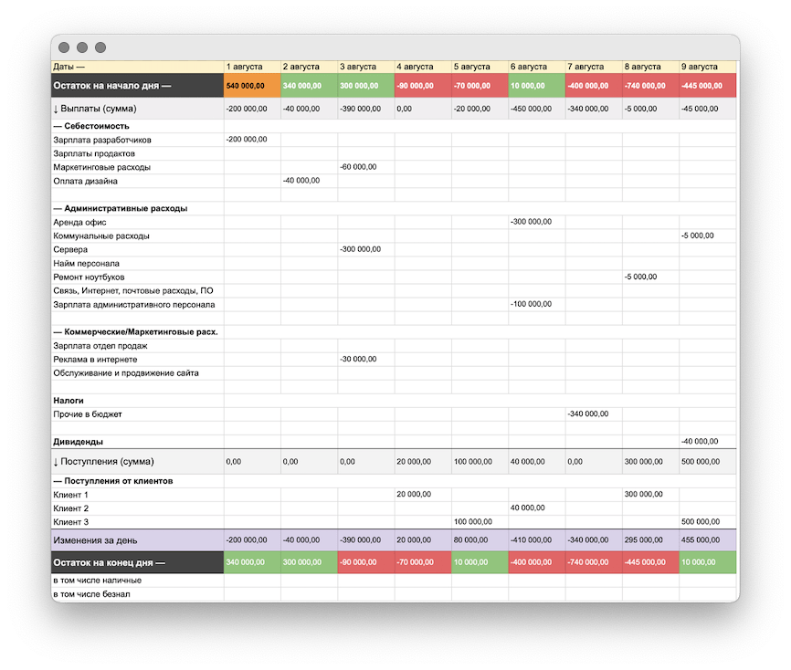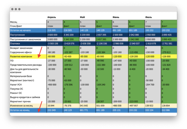 Совет 1. Использовать бюджет и платежный календарь. Простой способ защититься от кассовых разрывов при масштабировании — это бюджет или платежный календарь. В бюджете нужно спланировать, сколько денег можно потратить на рост, чтобы на операционку тоже хватило. Бюджет выглядит так:
