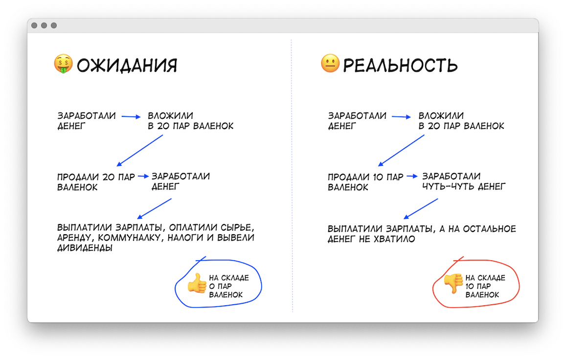 Компания потратила всё на рост и у нее не осталось денег на операционку: аренду, коммуналку, сырье, налоги. Так случилось, потому что компания увеличила расходы до того, как увеличила продажи: потратили деньги на производство, но при этом половину валенок не смогли продать.