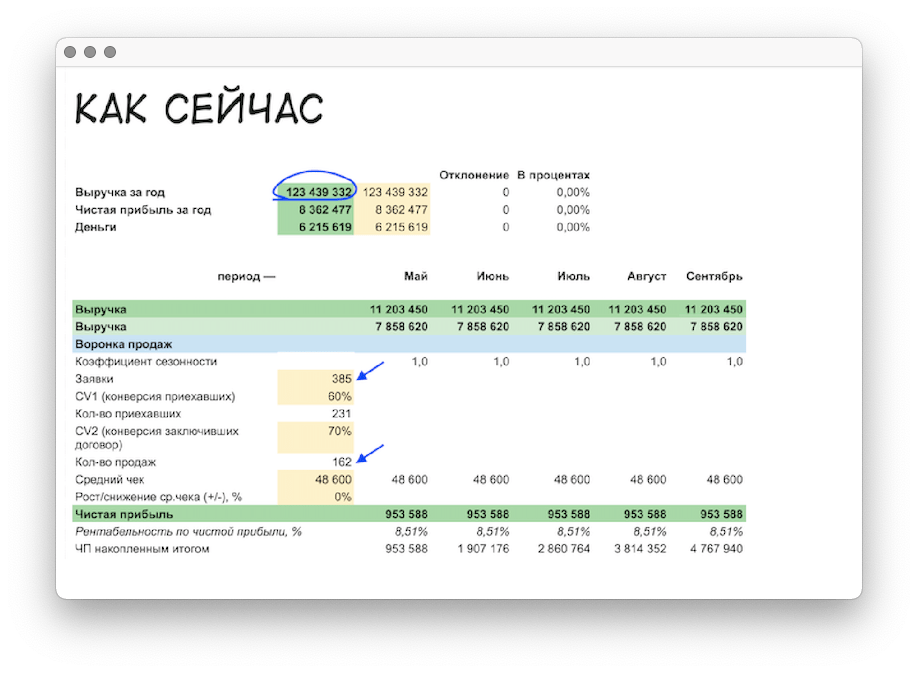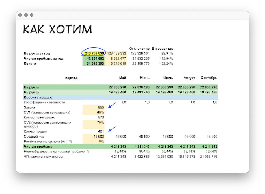 Например, финансовая модель может показать, что для роста выручки вдвое компании нужно сделать в 2,4 раза больше продаж. А для этого — получить в 2,4 раза больше заявок. Если одна заявка обходится в 500 рублей, значит, бюджет на маркетинг нужно будет увеличить с 192 500 рублей до 477 500 рублей. Без этого роста продаж не достичь.