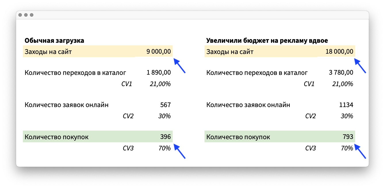 Совет 1. Прикинуть загрузку при росте. Сделать это можно по воронке продаж, например, посмотреть, что будет с заказами, если увеличить заходы на сайт в два раза. А затем оценить: хватает ли компании мощностей, чтобы выполнить планируемое число заказов. И подумать, что сделать, чтобы хватило: купить оборудование, нанять людей, закупить сырье или что-то еще.