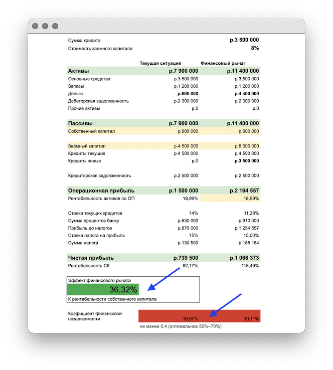 А еще — рассчитать эффект финансового рычага. Финансовый рычаг — это инструмент, который позволяет увеличить прибыль компании за счет заемных средств: берем чужие деньги, прикладываем к своим и получаем больше прибыли — это в идеале. Например, компания взяла кредит на 1 млн рублей, вложила его в рекламу, получила рост продаж и за ним — рост прибыли. Отдала проценты и тело кредита и осталась в плюсе — рычаг сработал.