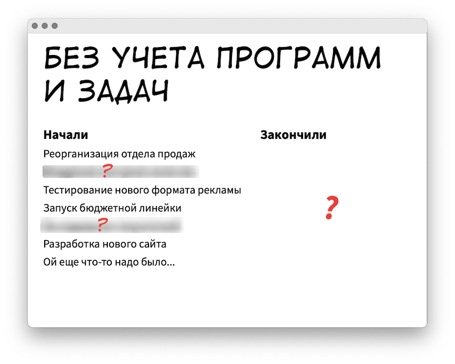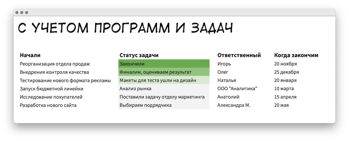 Совет. Вести учет программ. Чтобы четко понимать, что сейчас у компании в работе и что уже было сделано, нужно вести учет программ и больших задач. Программы — это активности, которые направлены на то, чтобы компания переходила на новый уровень, например: