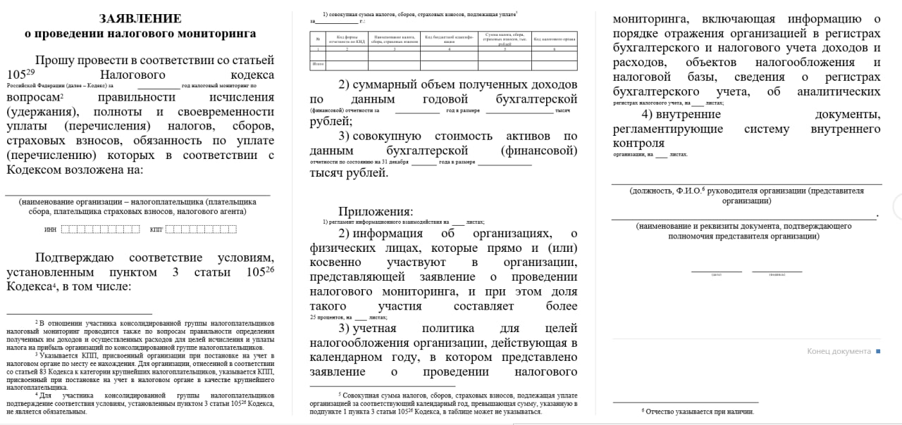 заявление о проведении налогового мониторинга;