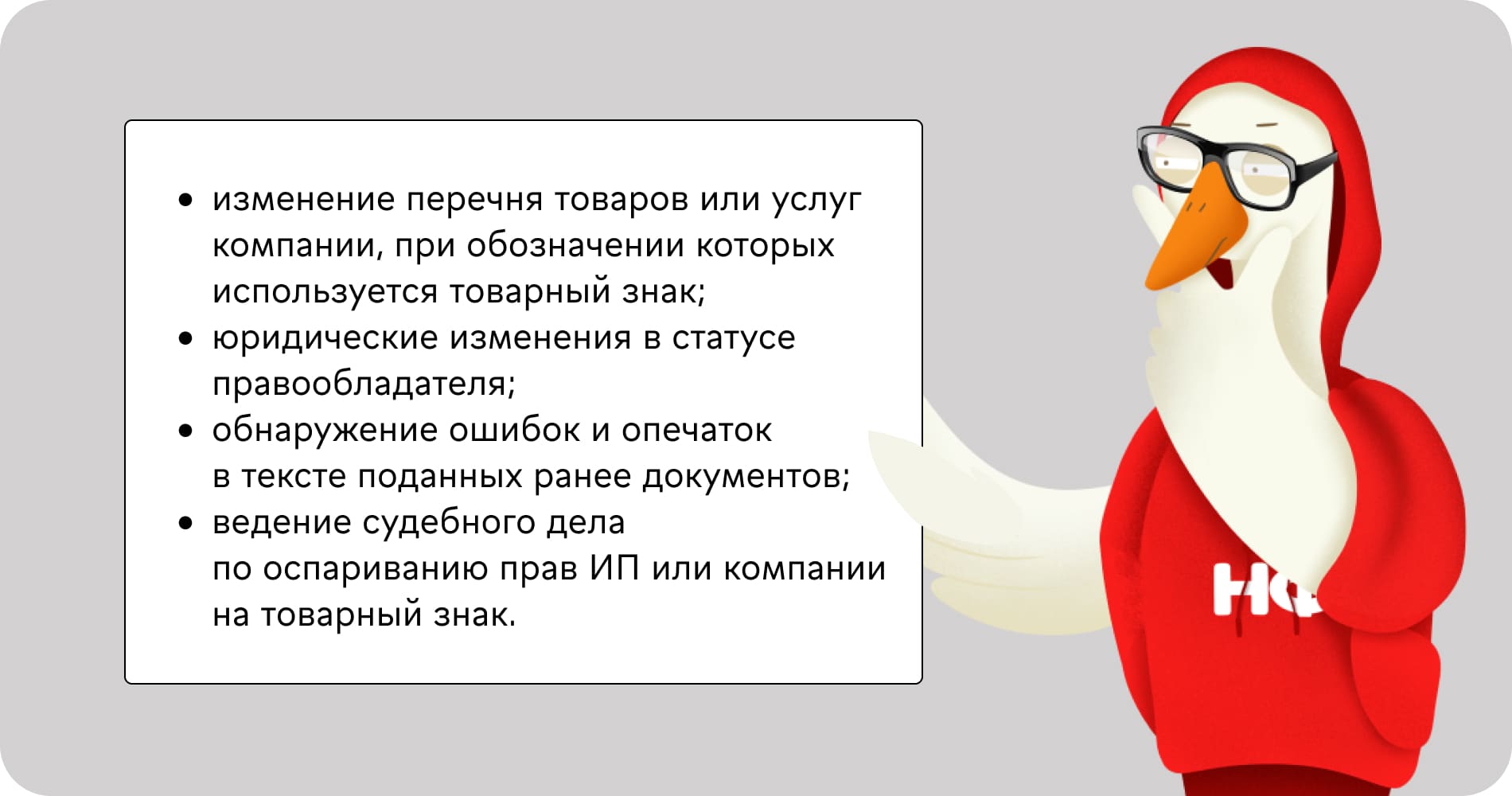 Срок действия товарного знака составляет 10 лет. Бизнесу редко удается пройти такой длинный путь без изменений. Как минимум в компании может произойти ребрендинг, как максимум — полная смена. Законом предусмотрены следующие случаи, когда собственник может обратиться в Роспатент для внесения изменений: