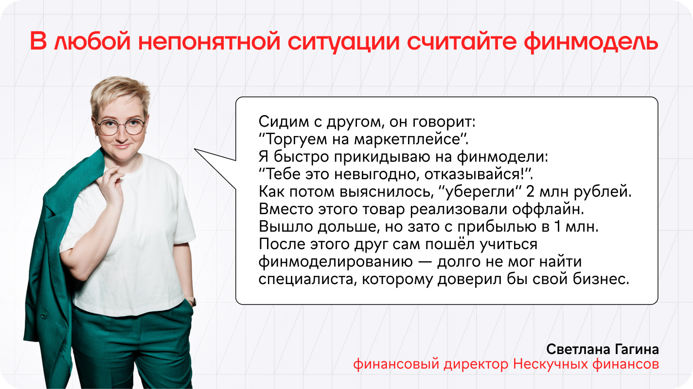 «Случился кассовый разрыв. Кредит возможен лишь под огромный процент. Кажется, проще закрыться. С партнером выбирались шесть месяцев. Знакомый финансовый менеджер показал: если бы разложили заранее свои расходы-доходы в финансовой модели, то не оказались бы на грани. Как только вздохнули, пошел в Нескучные учиться строить финмодель. И сам хочу уметь, и чтобы потом нанять финансового менеджера и понимать, чем его озадачивать».