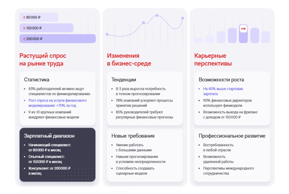 Многие наши ученики растут в рамках своей нынешней профессии. Это то, о чём мы говорили в начале статьи. Работа с куда большим доходом, карьерный рост, интересные задачи. Финансовые модели дают новый ракурс на бизнес-процессы, позволяют принимать только обоснованные решения и управлять будущим.